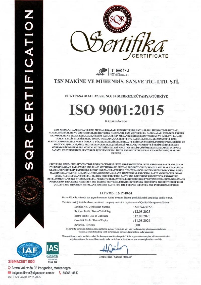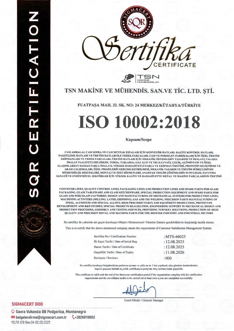 TSN Makine; hassas talaşlı imalat, özel ekipman üretimi ve anahtar teslim çözümlerle; cam ambalaj, porselen, savunma, otomotiv, konveyör ve gıda sektörü başta olmak üzere geniş bir yelpazede hizmet sunmaktadır. Mühendislik kabiliyetlerimiz, prototipten seri üretime kadar süreçleri kapsar ve kalite kontrol, yüzey işlemleri ile sonlandırılır.