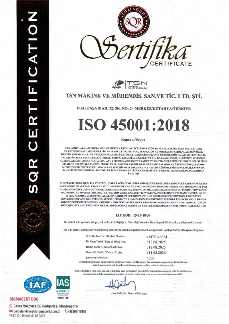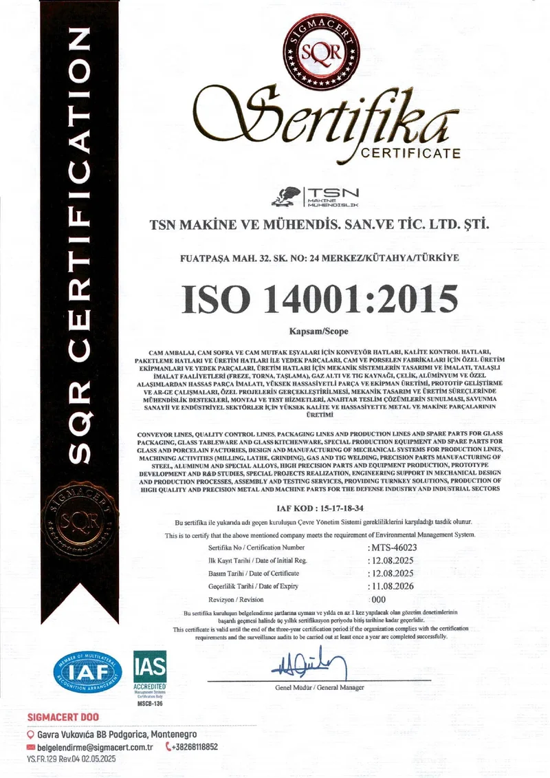 TSN Makine olarak, kalite yönetiminden çevre korumasına, iş güvenliğinden müşteri memnuniyetine kadar tüm süreçlerimizde uluslararası standartlara uygun çalışıyoruz. Sertifikalarımız, 35 yıllık deneyimimizle birleşen güvenilirliğimizin kanıtıdır.